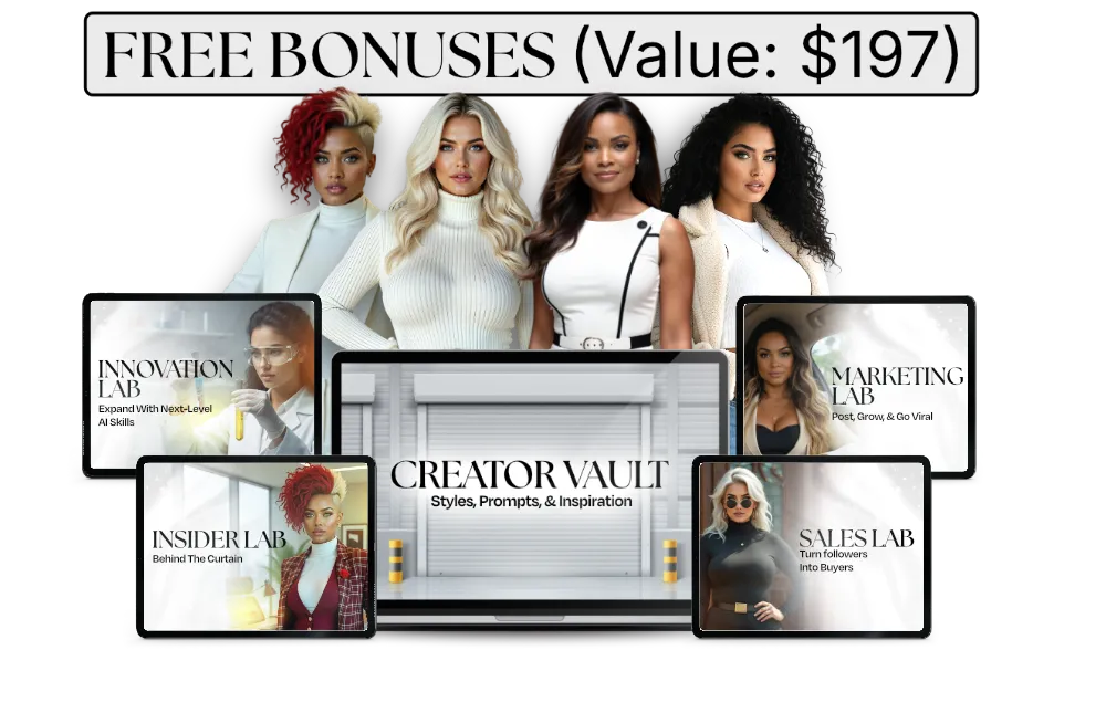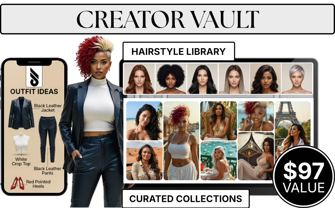 FREE BONUS - CREATOR VAULT– Curated collections of looks, styles, prompts, and weekly outfit drops to keep your AI persona fresh and magnetic.
